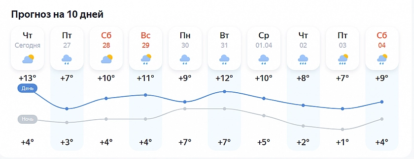 28 марта: +7 °C (днём +10, ночью +4)